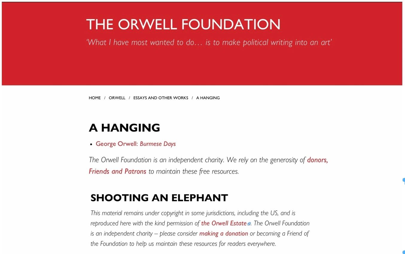 https://www.orwellfoundation.com/the-orwell-foundation/orwell/essays-and-other-works/a-hanging/ https://www.orwellfoundation.com/the-orwell-foundation/orwell/essays-and-other-works/shooting-an-elephant/