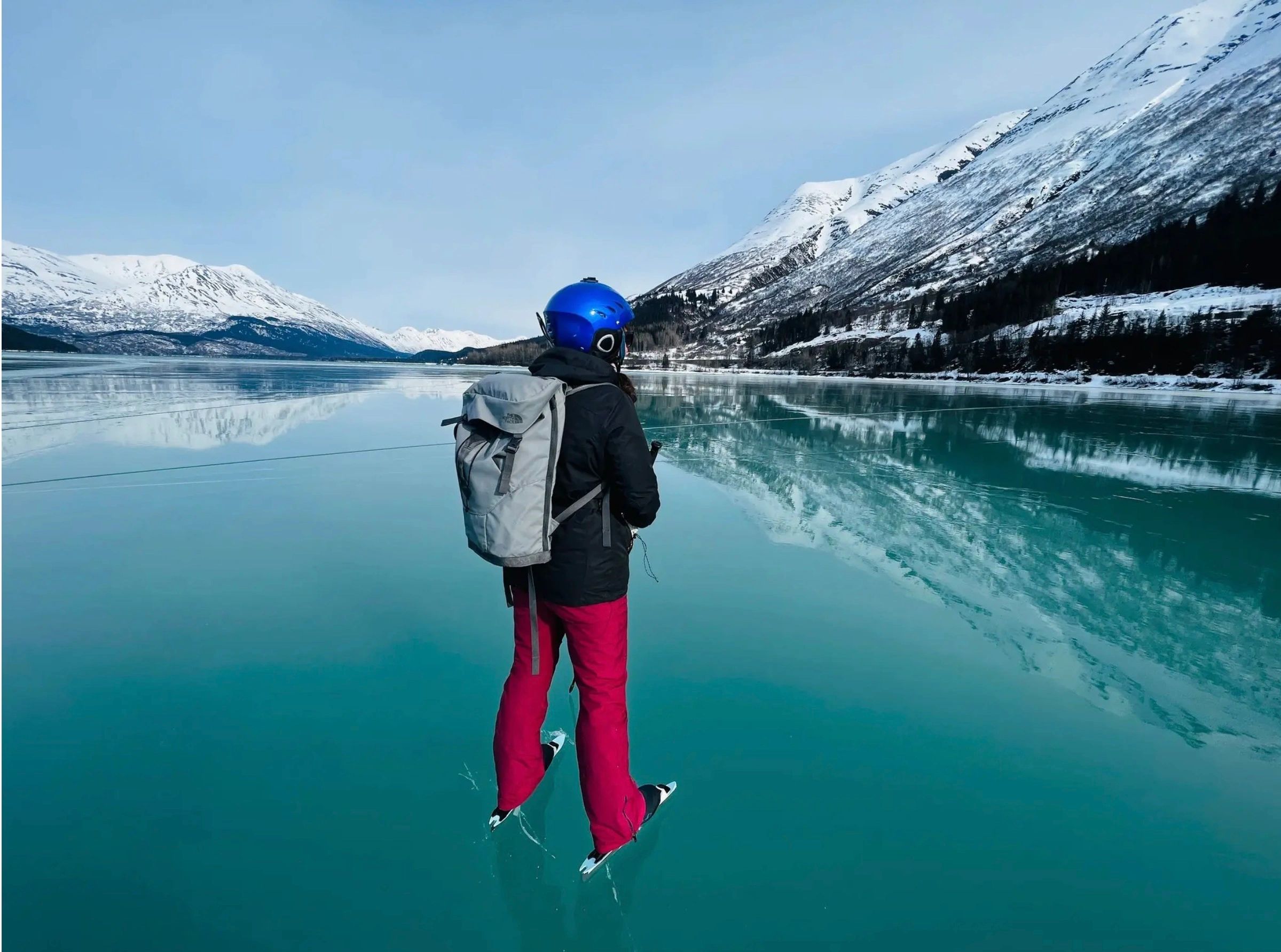 "In Alaska, the Rare Thrill of ‘Wild’ Ice Skating." "... a two-week, high-pressure window of cold, clear weather froze lakes south of Anchorage ... Elaine Glusac, on Kenai Lake, a long, deep, zigzagging body of water about 100 miles south of Anchorage. Credit..Luc Mehl"